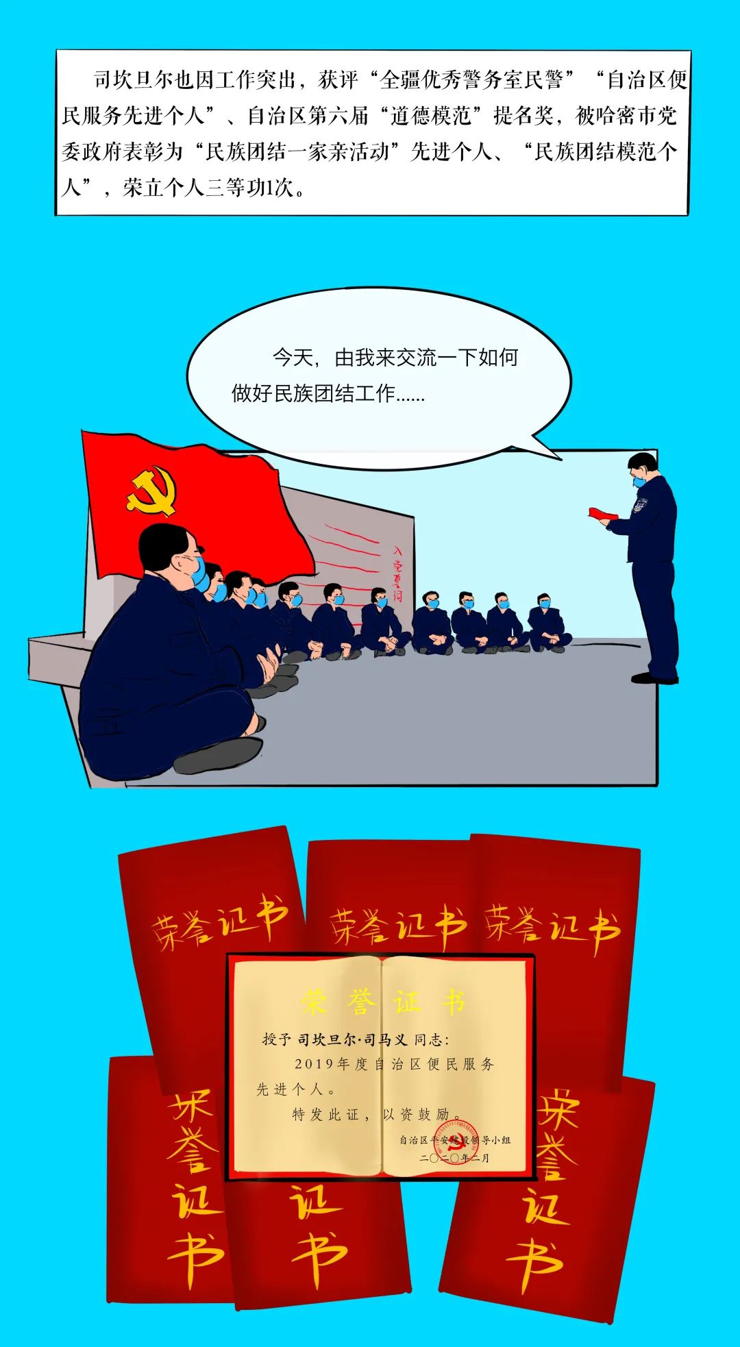 因工作成績突出,司坎旦爾先后獲評“全疆優秀警務室民警”“自治區便民服務先進個人”、自治區第六屆“道德模范”提名獎,被哈密市黨委政府表彰為“民族團結一家親活動”先進個人、“民族團結模范個人”,榮立個人三等功1次。