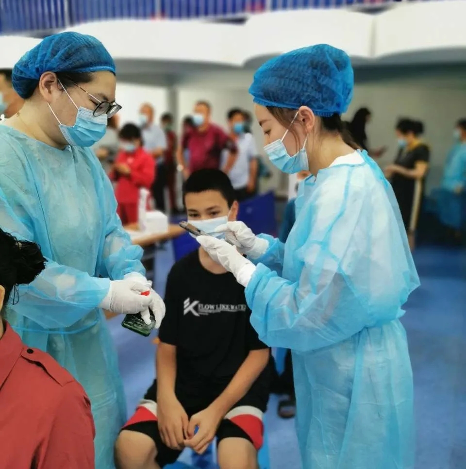 這張照片是同事錢瑤(右一)在核酸檢測點登記居民信息時,我抓拍到的。