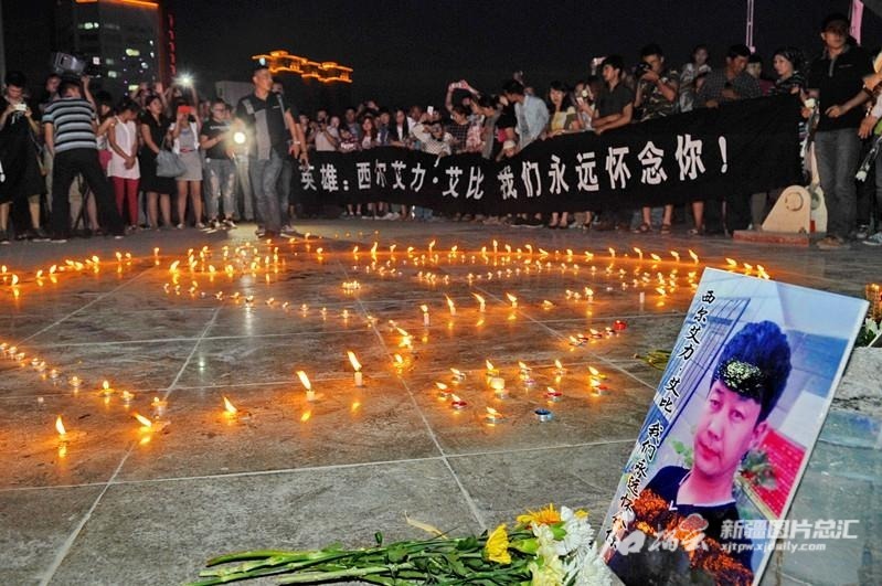 西爾艾力·艾比為救落水者犧牲的消息傳開后,許多庫爾勒市民自發手捧鮮花、蠟燭來到孔雀河邊,表達對英雄的敬意和緬懷之情。