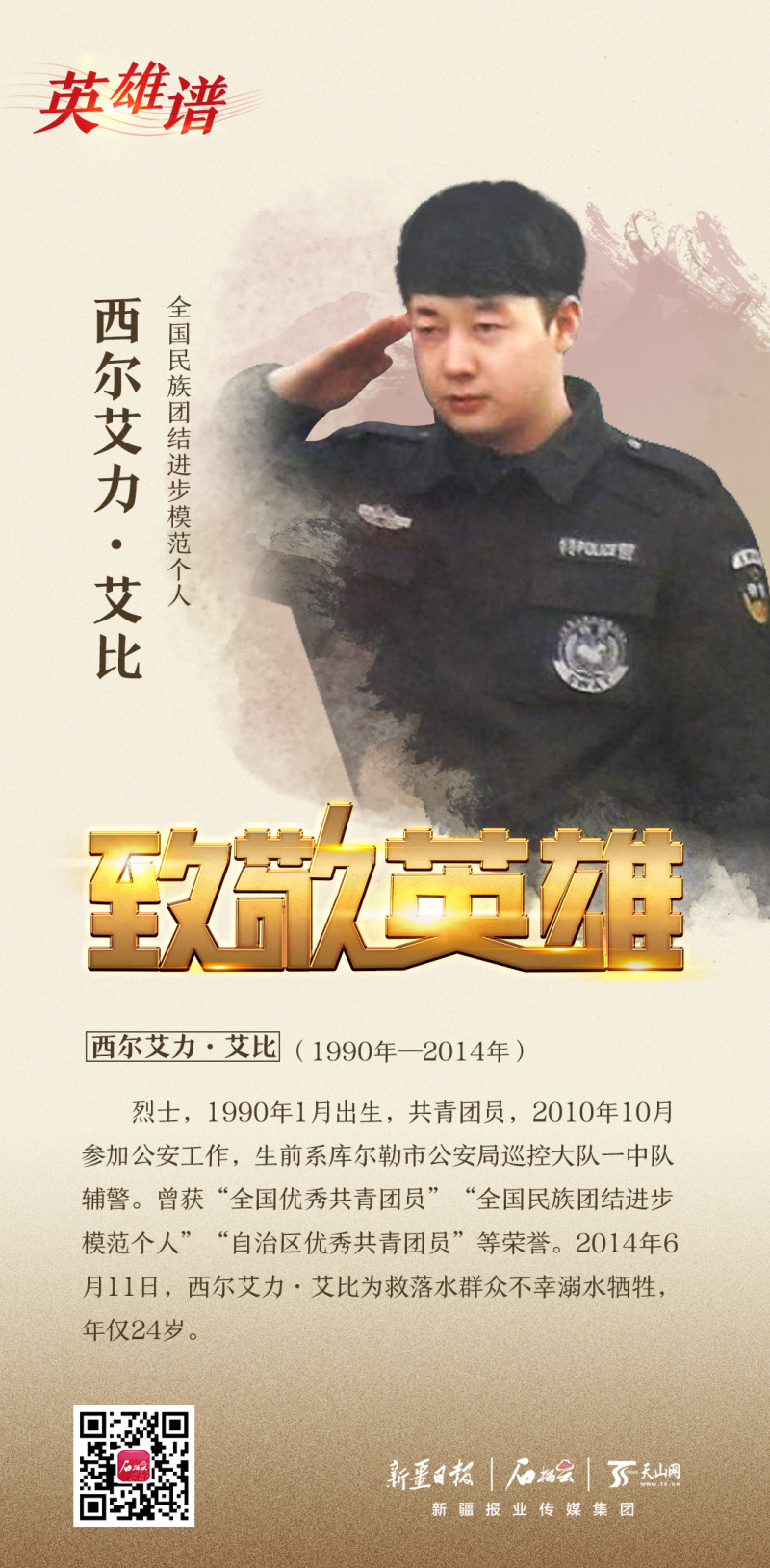 西爾艾力·艾比,烈士,生前系庫爾勒市公安局巡控大隊一中隊輔警,參加公安工作以來,獲得“全國優秀共青團員”“全國民族團結進步模范個人”等多項榮譽。2014年6月11日,西爾艾力·艾比為救落水群眾不幸溺水,犧牲時年僅24歲。