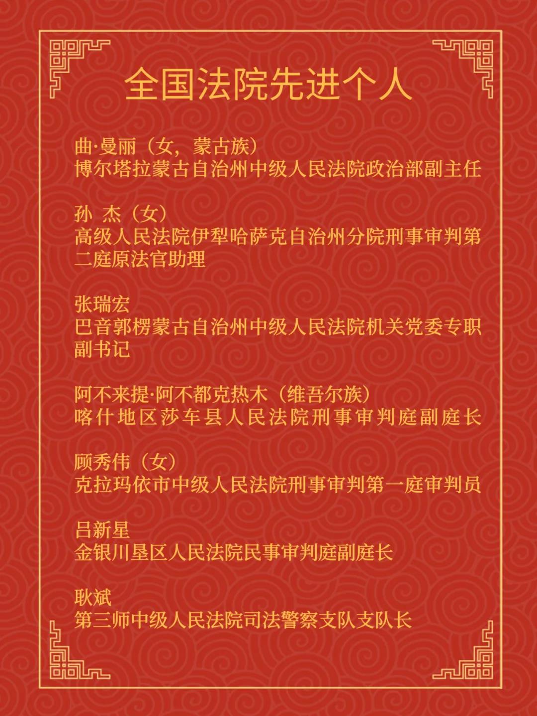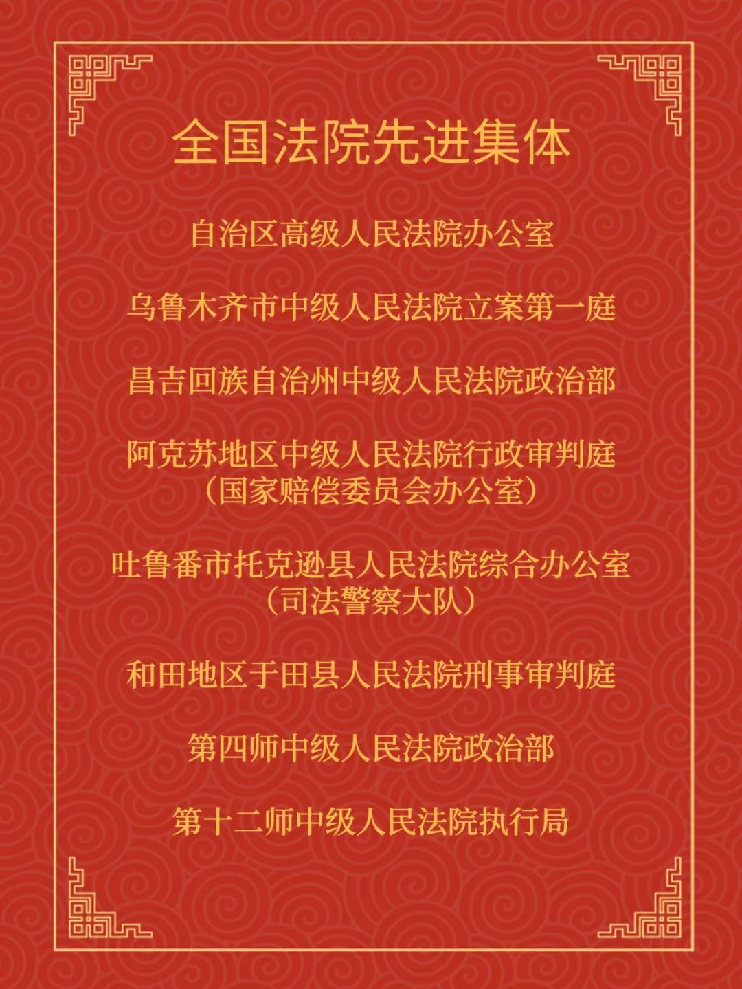 日前,最高人民法院印發(fā)決定,授予北京市第二中級(jí)人民法院刑事審判第一庭等197個(gè)集體“全國(guó)法院先進(jìn)集體”稱號(hào),授予王亞茹等195名同志、追授馮國(guó)生等3名同志“全國(guó)法院先進(jìn)個(gè)人”稱號(hào)。其中,新疆(含兵團(tuán))法院8個(gè)集體和7名個(gè)人榜上有名。(最高人民法院)