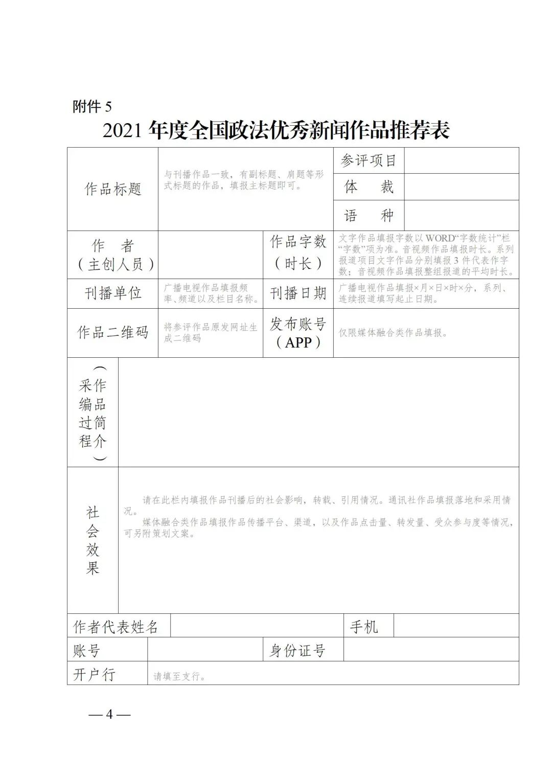 7.媒體融合類作品,須在《推薦表》中“發布賬號(APP)”欄填報規范名稱;“社會效果”欄填寫作品傳播平臺、渠道,以及作品點擊量、轉發量、受眾參與度等情況,可另附策劃文案。參評“移動直播”獎項,須附1份1000字以內的直播簡介,包括直播意義、直播流程和規模、直播點設定和社會影響等內容。