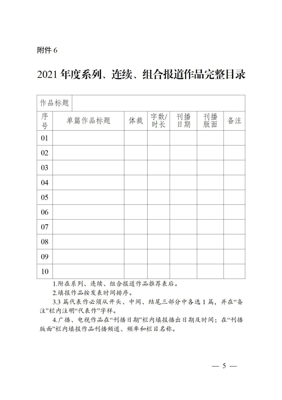 系列(連續、組合)報道作品,單件作品不得少于3篇,以所申報的每件代表作體裁適用相應項目規定,廣播作品作者(主創人員)超過7人按“集體”申報,電視作品作者(主創人員)超過8人按“集體”申報。刊播時間跨年度的系列報道和連續報道,按作品結束時的刊播年度申報。