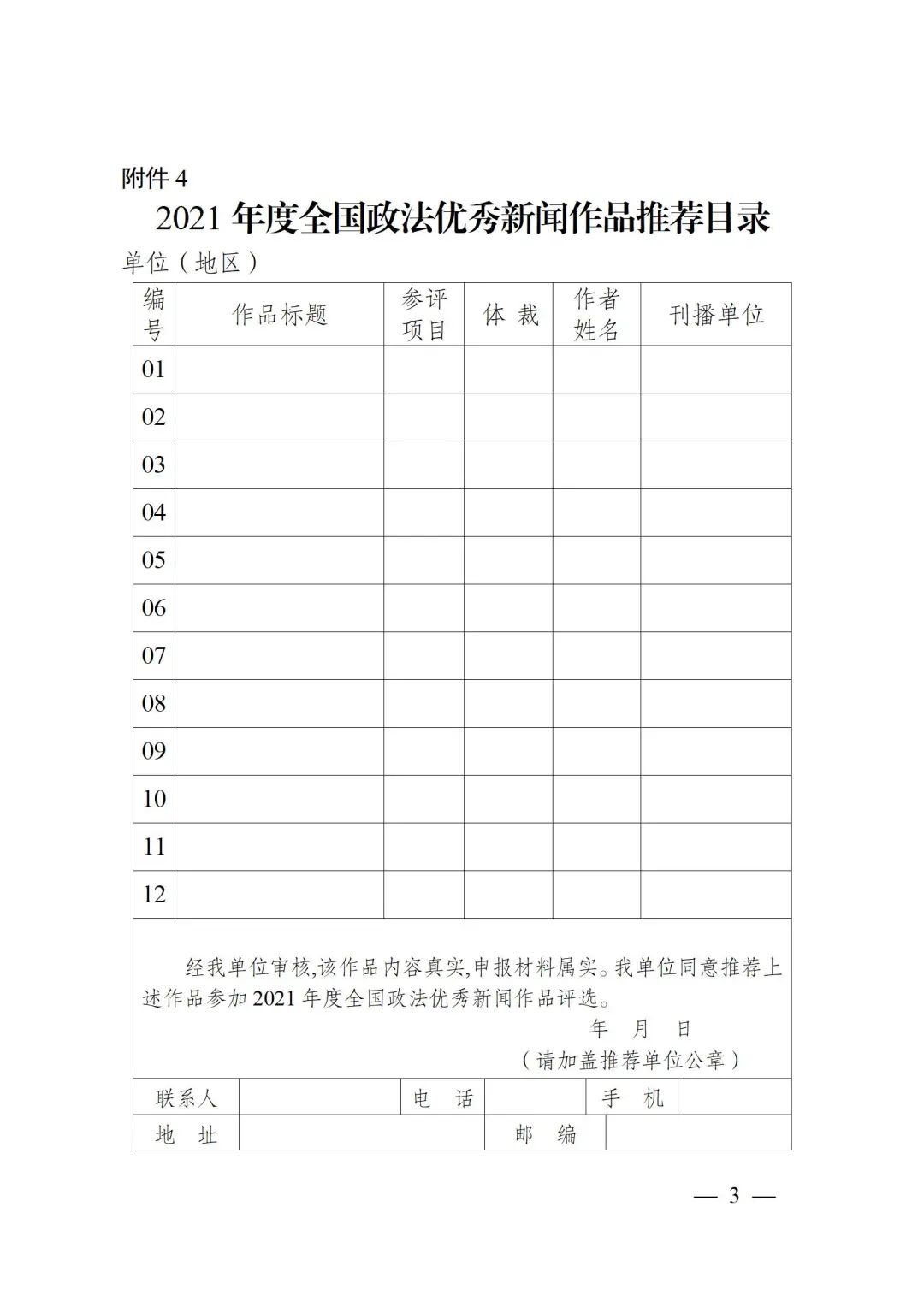 經中央政法委領導批準,現啟動2021年度全國政法優秀新聞作品評選工作。各地各單位接到通知后,請嚴格按照《全國政法優秀新聞作品評選辦法》(附件1)和《2021年度全國政法優秀新聞作品評選參評作品報送須知》(附件2)的要求,根據《2021年度全國政法優秀新聞作品評選參評作品數額分配方案》(附件3,以下簡稱《數額分配方案》),認真填寫《2021年度全國政法優秀新聞作品推薦目錄》(附件4,以下簡稱《推薦目錄》)《2021年度全國政法優秀新聞作品推薦表》(附件5,以下簡稱《推薦表》)《2021年度系列、連續、組合報道作品完整目錄》(附件6),于2022年4月22日前完成初評及推薦作品報送工作。聯系人:萬云,聯系電話:010—83079176。
