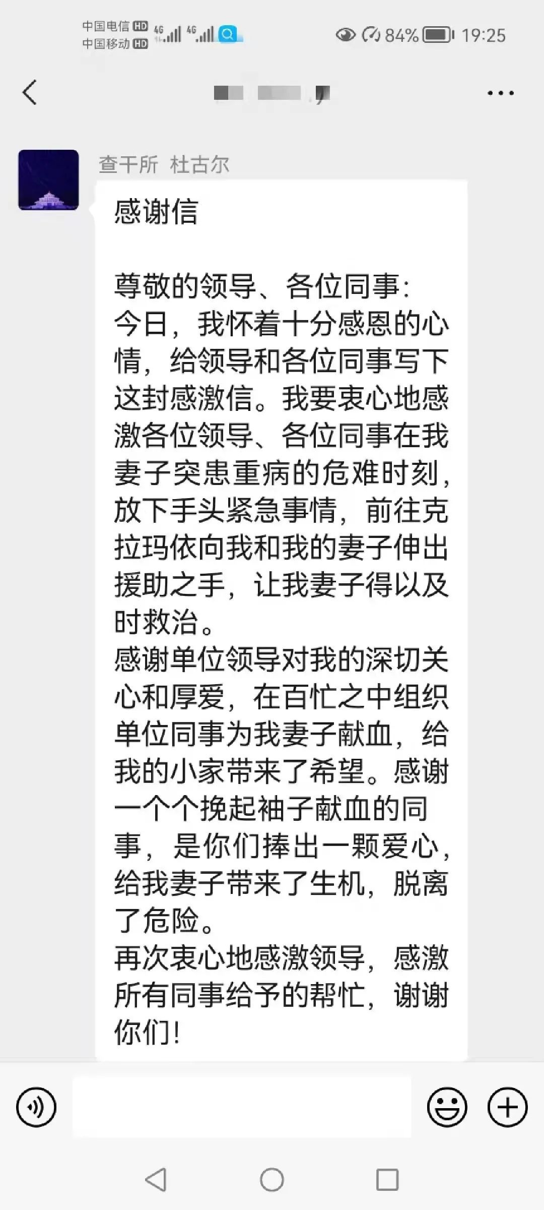 19:18,杜古爾給單位打來電話告知妻子已轉危為安,并專門發了一篇感謝信:衷心地感激各位領導、各位同事在我妻子突患重病的危難時刻,大家都能伸出援助之手,讓我妻子得以及時救治,感謝大家!是你們捧出一顆愛心,給我妻子帶來了生機,脫離了危險。