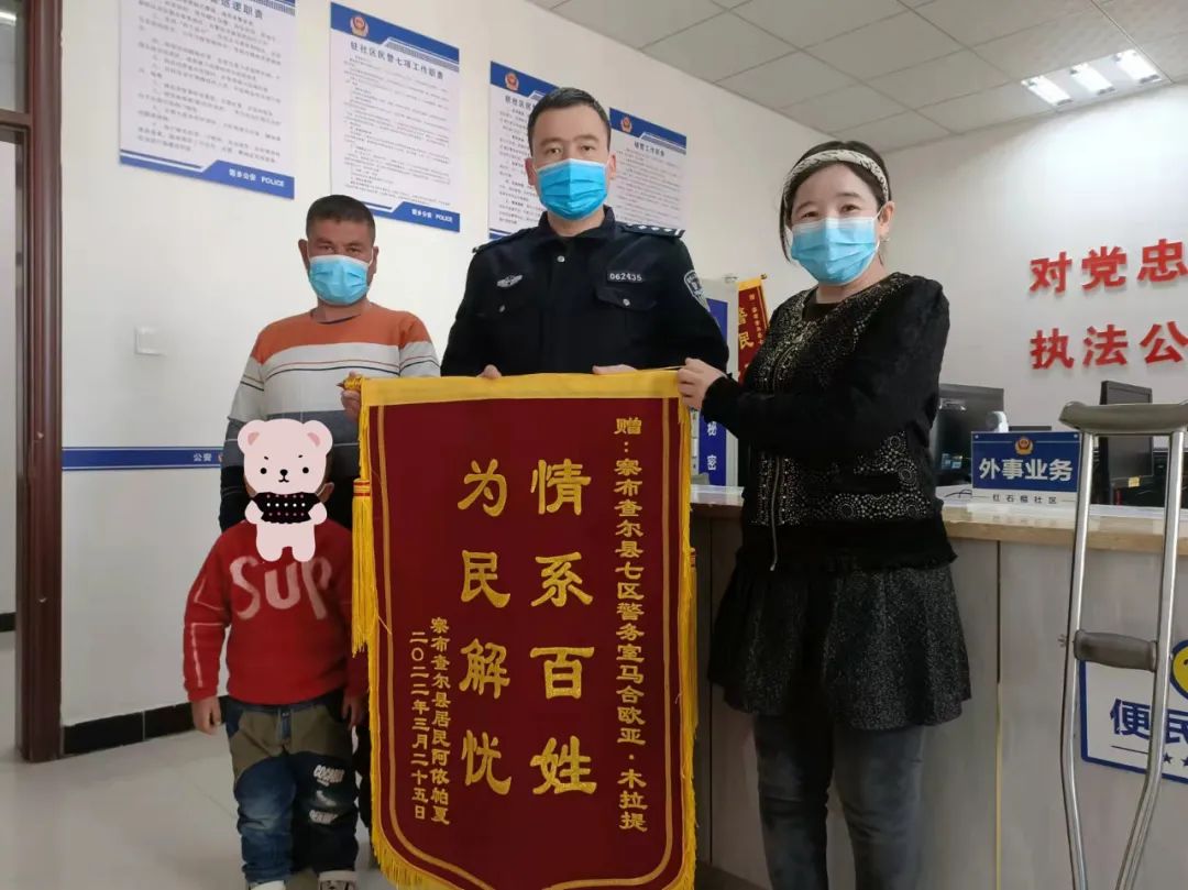 當馬合歐亞將孩子的戶口本送到米吉提手中時,米吉提十分激動,不停地說著“感謝”。事后帶著孩子來到城鎮派出所紅石榴社區警務室,將一面寫有“為民解憂、情系百姓”的錦旗送到民警手中。(郭金萍)
