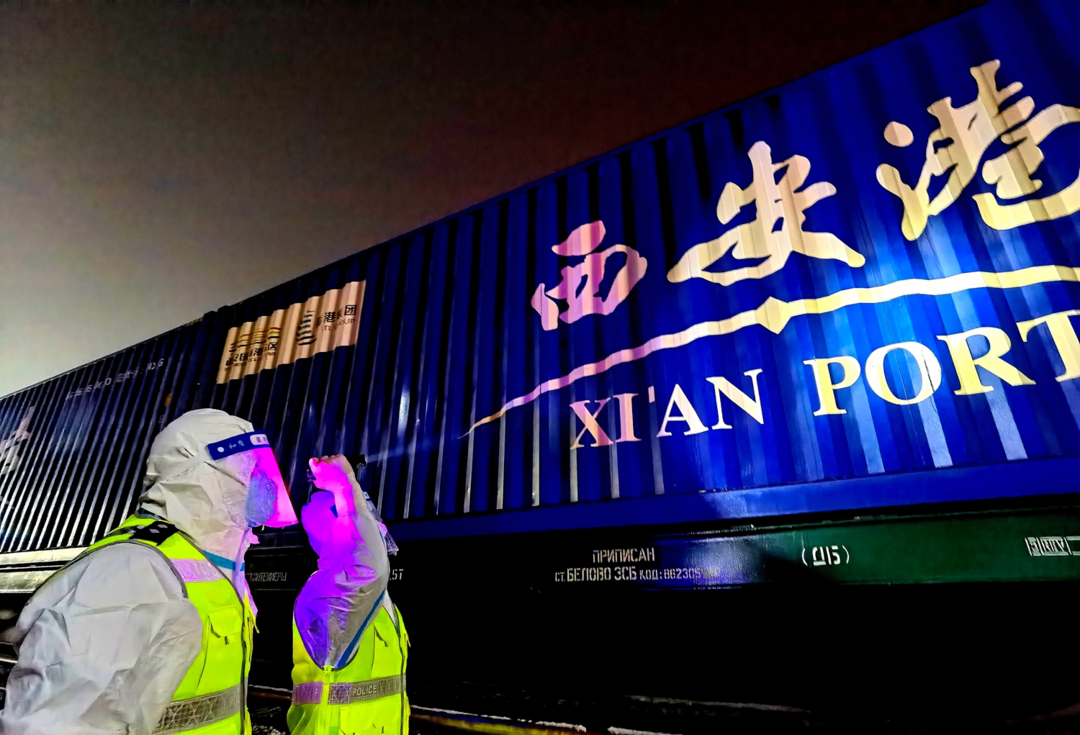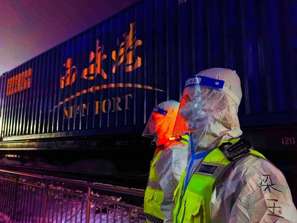 “大家注意,這是今天我們迎接的首趟入境中歐班列,大家要嚴格按照防疫要求,把控好查車速度。”23時45分,執勤隊長完成了對執勤防護裝具的逐人檢查,民警按照三人一組的分工,持手電筒,沿著鐵軌旁近1000米長的石子路向既定點位走去。