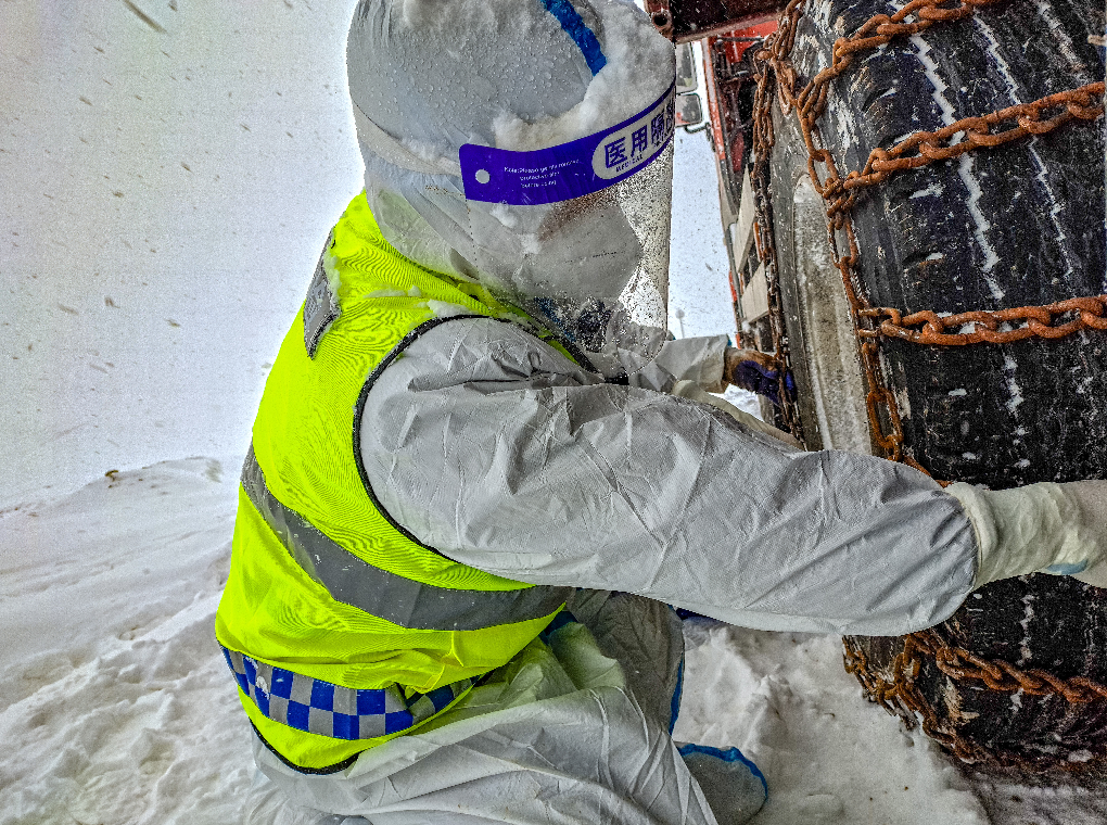 為保證載運貨物的通關車輛能夠順利進行吊裝作業,吐爾尕邊檢站前哨班迅速啟動惡劣氣候應急預案,立即與吉爾吉斯斯坦邊檢機關進行電話會晤,達成延時通關共識。隨后,民警立即清理道路積雪,并聯系鏟車助力清理積雪。最終,民警克服高寒缺氧,經過3個多小時的連續奮戰,5公里受阻道路順利疏通,被困的30輛貨運貨車輛成功抵達國門前沿。