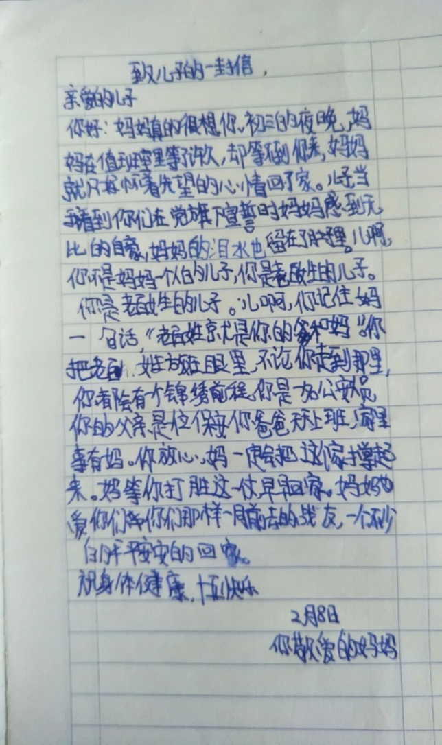 后來,母親讓孫子代筆給王建嬌寫了一封信,“你不是媽媽一個人的兒子,你是老百姓的兒子……你和一同前去的戰友要一個不少平平安安地回家……”讀著讀著,王建嬌眼前模糊了……