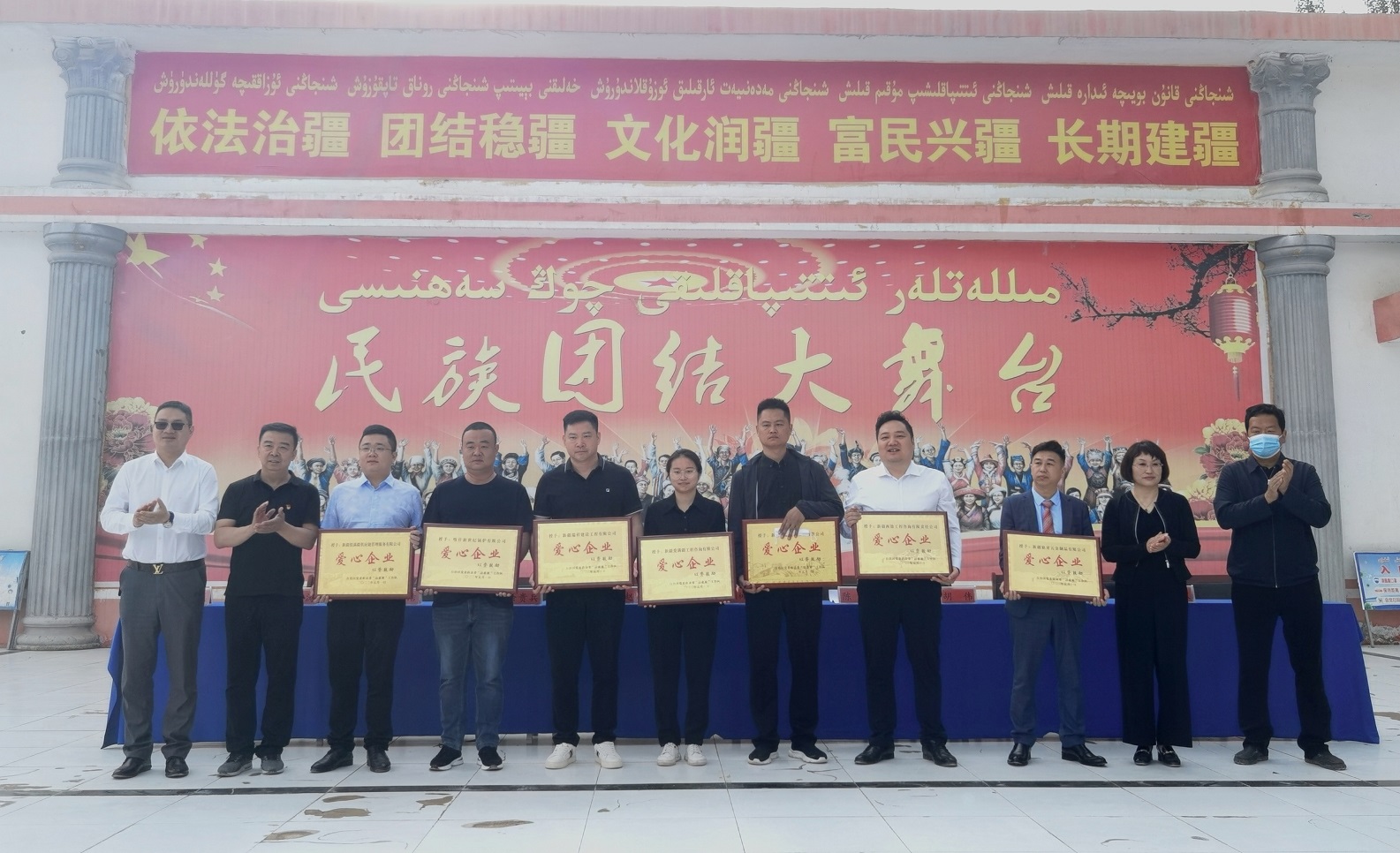 活動中,新疆愛滿江工程咨詢有限公司、喀什新世紀鍋爐有限公司等七家愛心企業為優秀黨員、最美庭院戶主、致富帶頭人等村民代表捐贈米面油生活物資各100件。“訪惠聚”駐村工作隊隊長陳強為七家企業頒發愛心企業獎牌。