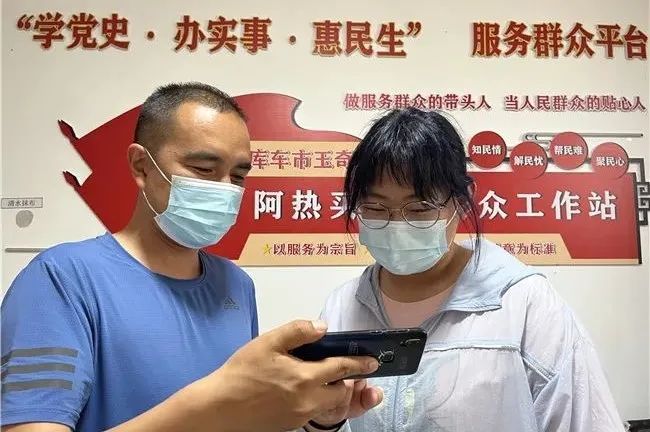 阿克蘇地區庫車市人民檢察院駐玉奇吾斯塘鄉阿熱買里村“訪惠聚”工作隊員通過手機收看慶祝中國共產主義青年團成立100周年大會。劉宇 攝