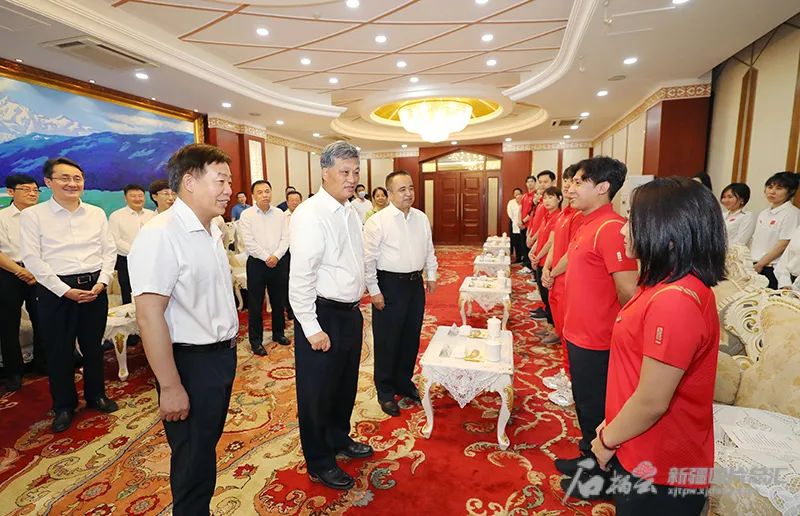 6月25日,自治區黨委書記馬興瑞、自治區主席艾爾肯·吐尼亞孜在烏魯木齊會見北京冬奧冠軍行首站活動“天山行”的優秀運動員、體育工作者。石榴云/新疆日報記者 崔志堅 攝