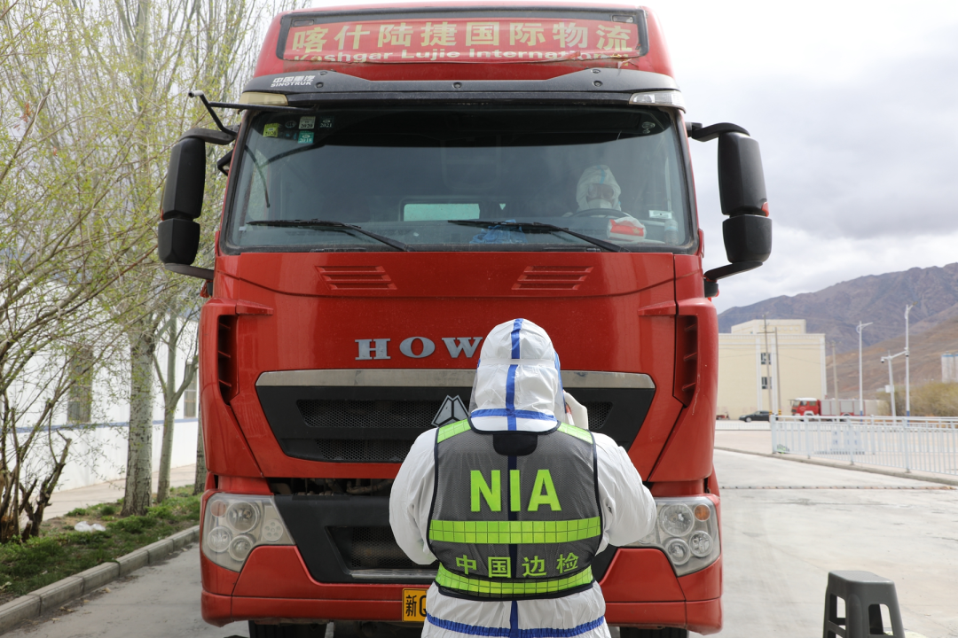 國門下,身著防護(hù)服的新疆出入境邊防檢查總站伊爾克什坦出入境邊防檢查站執(zhí)勤民警在緊張有序地忙碌著。當(dāng)夕陽漸漸消失在天邊時,民警才完成當(dāng)日最后一輛貨車的通關(guān)保障任務(wù)。