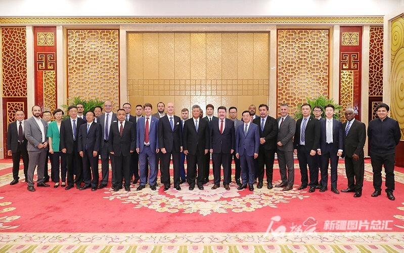 7月5日,自治區黨委書記馬興瑞,自治區黨委副書記、自治區主席艾爾肯·吐尼亞孜在烏魯木齊會見來新疆參訪的在華外國工商界代表團一行。石榴云/新疆日報記者 崔志堅攝