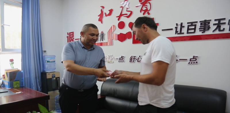 新疆平安網訊 7月25日,在疏附縣吾庫薩克鎮瓊巴格村矛盾調解室內,該縣站敏鄉艾日克貝西村村民艾某數了數手里的1萬元現金,笑了。