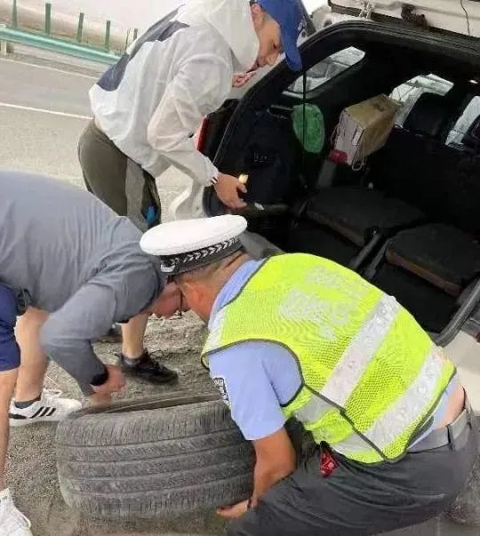 8月1日,游客安女士一行8人駕車從喀什前往庫(kù)爾勒途中,行駛至輪臺(tái)縣境內(nèi)時(shí),其中一輛車發(fā)生爆胎,而車內(nèi)的乘客和司機(jī)均不會(huì)換胎。恰巧兩位巡邏民警駕車經(jīng)過(guò),立即拿出工具幫忙換好輪胎,并護(hù)送安女士一行到達(dá)庫(kù)爾楚收費(fèi)站與接應(yīng)他們的車輛會(huì)合。