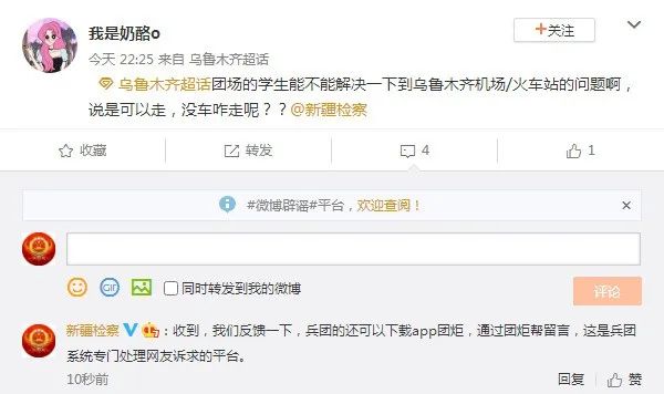 來自兵團的網友“@我是奶酪o ”因開學要到烏魯木齊轉乘飛機,但團場沒有直達烏魯木齊機場的線路車,遂在網上發貼求助,“@新疆檢察”獲悉后,迅速回應“收到,我們反饋一下。兵團系統還可以直播下載手機app‘團炬’留言處理。”