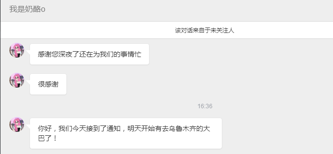 次日,網友通過私信回復,“你好,我們今天接到了通知,明天開始有去烏魯木齊的大巴了!”