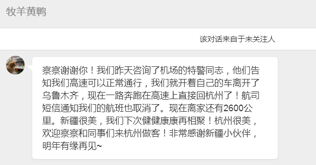 隔日,“@牧羊黃鴨”順利離烏返杭,出發前,他向“@新疆檢察”私信致謝。