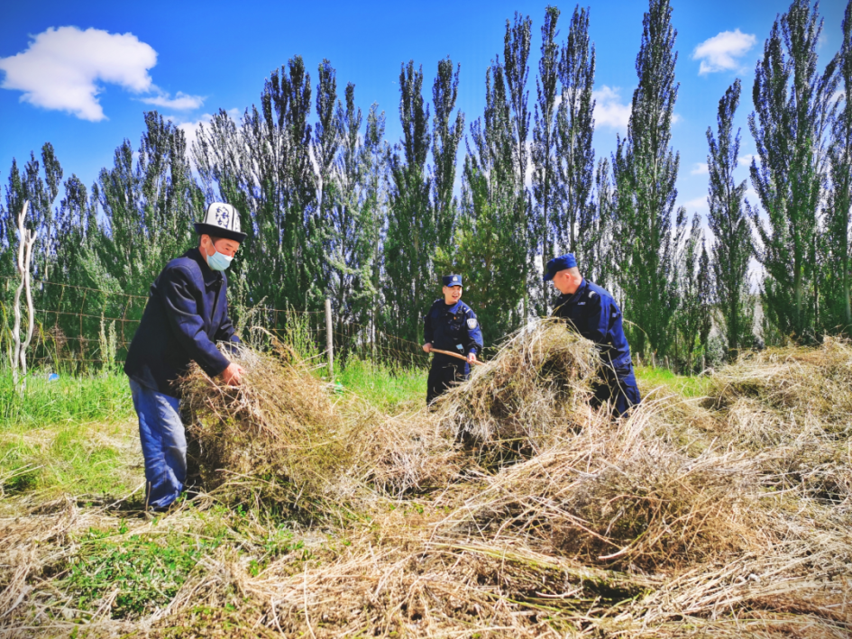 8月14日,新疆出入境邊防檢查總站克孜勒蘇柯?tīng)柨俗巫灾沃葸吘彻芾碇ш?duì)烏恰邊境管理大隊(duì)膘爾托考依邊境派出所組織民警幫助牧民打草、收草、囤草,同時(shí),講解疫情防控、邊境法律法規(guī)、防火等知識(shí)。(劉楠)