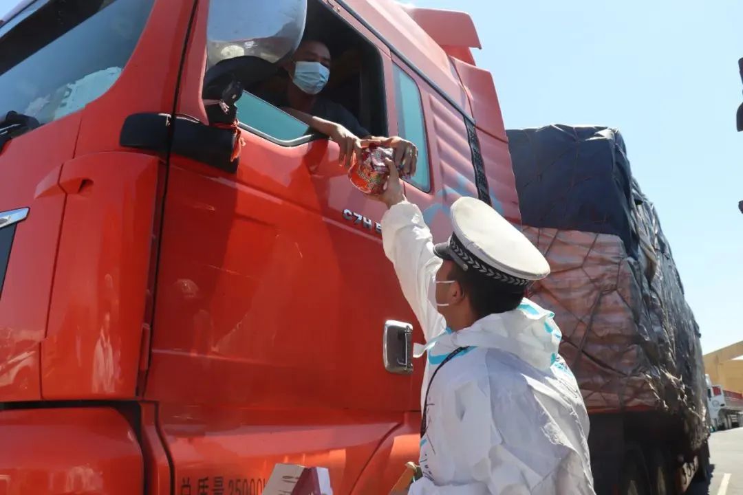 8月17日中午12時,在S114長春路出口50米處,一輛貨車緩緩靠邊停車,向正在路口執(zhí)勤的烏魯木齊市公安局交警支隊民警田野問路。當(dāng)田野看到駕駛員時,駕駛員臉上的口罩已經(jīng)破舊不堪,起不到防護(hù)的作用,同時駕駛員看起來臉色非常難看,田野迅速上前查看情況。經(jīng)詢問,該男子車上的物資早已用完,今天在駕駛過程中一口水都沒有喝,田野馬上拿出抗疫物資支援司機(jī),給司機(jī)換上新口罩,并耐心細(xì)致做好引路工作。