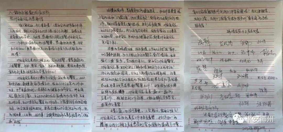 “在這里,感謝我們社區輔警鄧東海同志,感謝他的熱情、堅守和不改初心!更感謝小鄧警官為人的勤奮與樸實,還有為人民服務的熱情……”8月20日,一封由博爾塔拉蒙古自治州博樂市八一路社區36名居民聯名寫下的感謝信,送到了博樂市公安局青達拉派出所輔警鄧東海的手里。