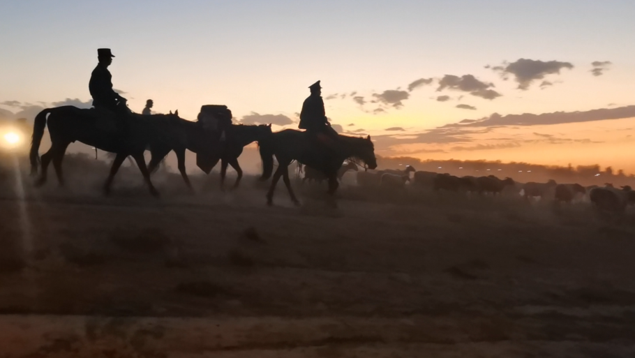 黝黑的皮膚、憨厚的漢子,一面黨旗、一個背包、幾匹烈馬——在被當地牧民稱之為“狼層”的夏季草場,一群群牛羊經由此地前往適合秋季放牧的秋牧場,護送它們的是幾名身著警服的“牧羊人”。