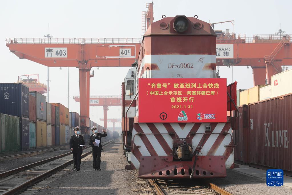 膠州海關關員對“齊魯號”歐亞班列上合快線(中國上合示范區——阿塞拜疆巴庫)線路首班列車進行檢查(2021年1月31日攝)。新華社發(解豪 攝)