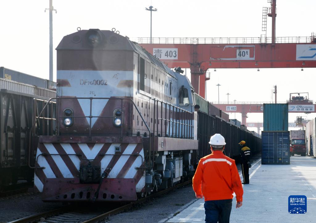 一列搭載輪胎、汽車配件、電子元件等貨物的“齊魯號”中亞班列即將發車駛出位于青島的中國-上合組織地方經貿合作示范區青島多式聯運中心(2020年11月9日攝)。新華社記者 李紫恒 攝