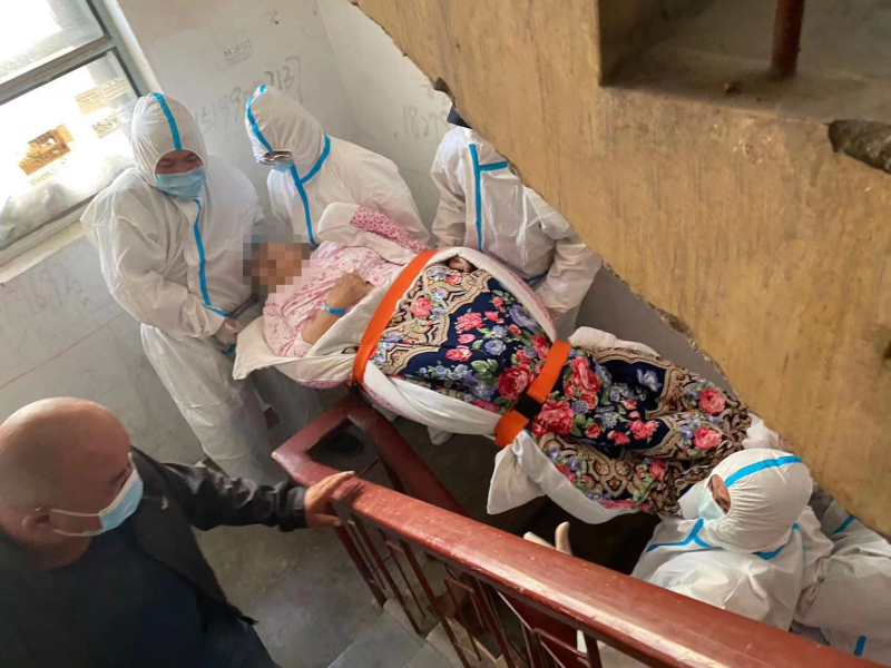 接警后,三名民輔警趕往現場,配合醫護人員一起用擔架將老人抬回家中。(額敏縣公安局)