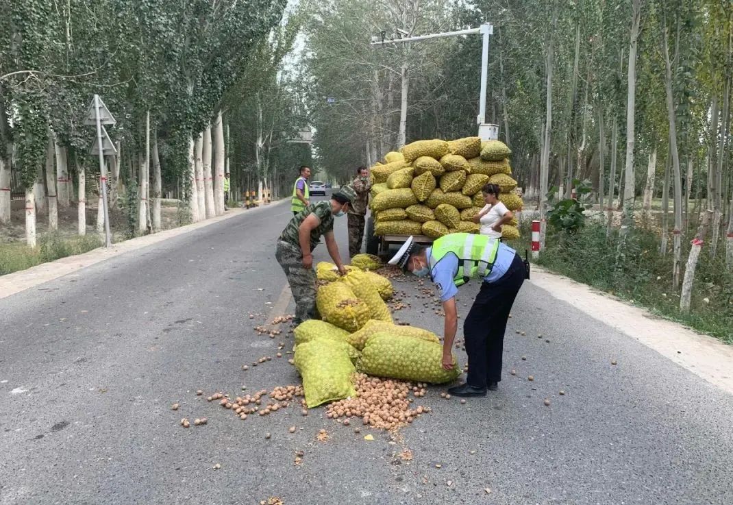 民警上前詢問,得知拖拉機駕駛員是當地農民,正往家運送地里采摘下來的核桃,但因裝載過滿,加之沒有固定措施,行駛至顛簸路段時上面的貨物就掉落了下來。