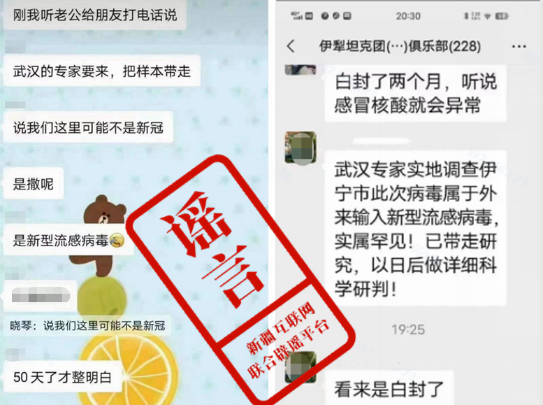 新疆平安網訊 接網民舉報,近日有網民在微信群圈、微博、抖音等平臺以短視頻、圖片或文字等形式散布“武漢專家實地調查伊寧市此次病毒屬于外來輸入新型流感病毒”等虛假信息及類似變種樣本。經與有關部門核實查證,上述信息為網絡謠言。