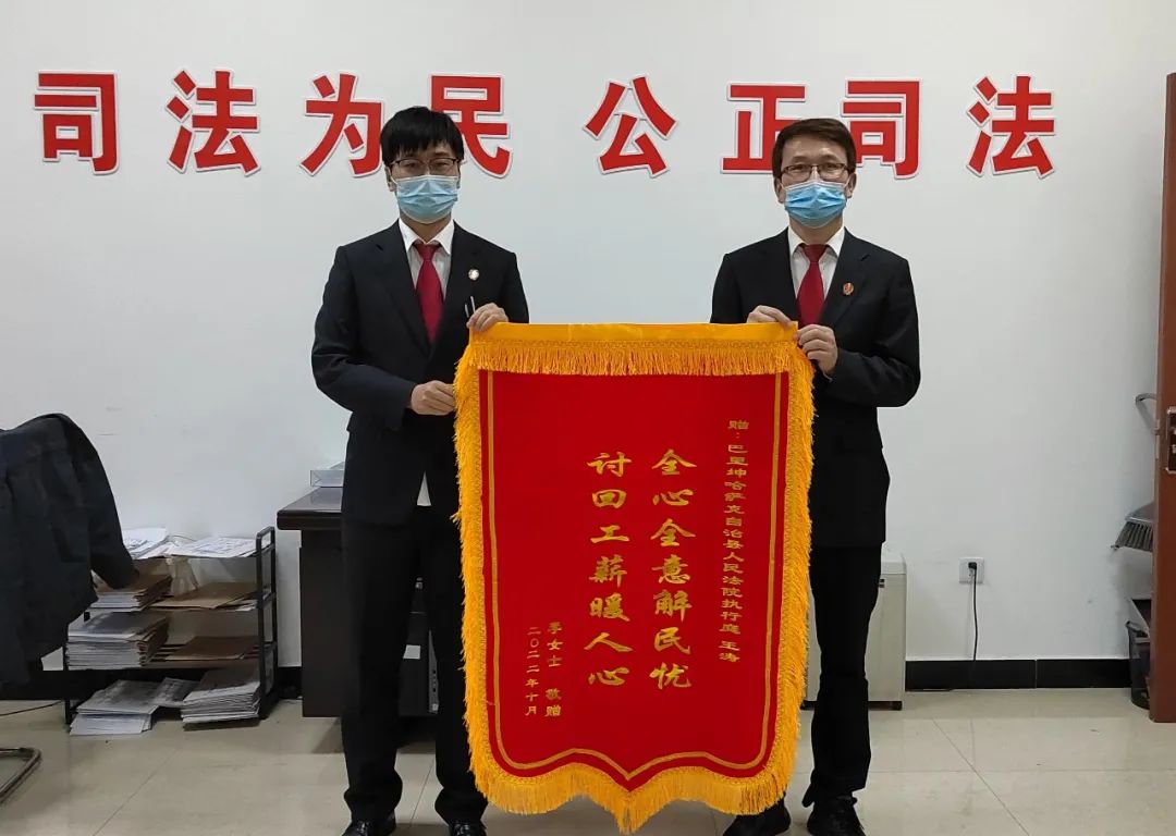 10月8日,哈密市巴里坤哈薩克自治縣人民法院執行局收到一面寫有“全心全意解民憂,討回工薪暖人心”的錦旗。