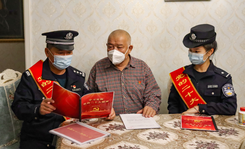 10月30日,裕民縣公安局機關黨支部宣傳民警來到退休干部家中,與退休干部一同學習黨的二十大精神。