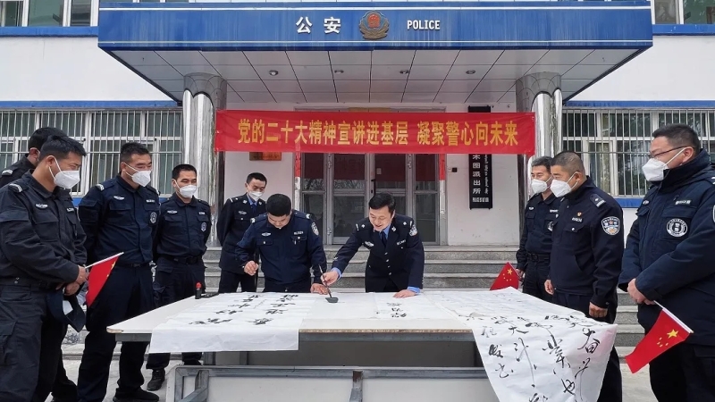 宣講民警傾情演唱《我和我的祖國》《不忘初心》;民警現場還書寫黨的二十大報告中的金句。