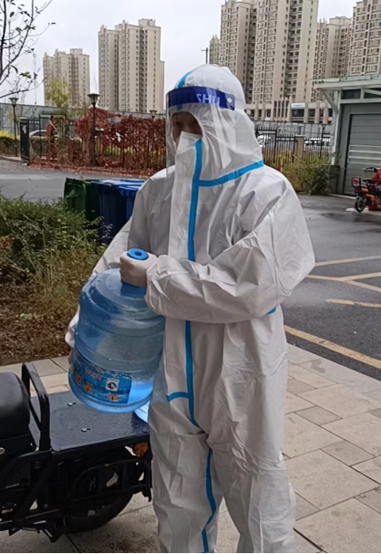 根據(jù)疫情防控要求,物資只能送到小區(qū)大門口,卸車、消殺、靜置,然后根據(jù)樓棟分別配送。楊雁飛每天負(fù)責(zé)從大門口將物資運(yùn)送到負(fù)責(zé)樓棟前,再一件一件送往居民家中,一天工作下來,衣服被汗水浸得濕漉漉的。