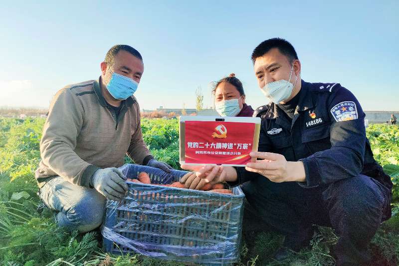 阿克蘇市公安局托普魯克派出所組織民警深入田間地頭幫助農民搶收農作物,同時與群眾面對面宣講黨的二十大精神,促進農民增收,助力鄉村振興,做到“宣講”“助農”兩不誤。“黨的政策亞克西,我們的生活更有奔頭了”,轄區居民艾合太木·依明說。