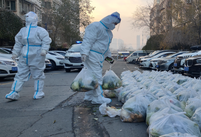 11月21日上午,在烏魯木齊市水磨溝區(qū)南湖北路街道宏瑞社區(qū)友好花園二期,郝帥和搭檔秦成昊奔走在樓宇之間,給居民們送生活物資、清運(yùn)垃圾。