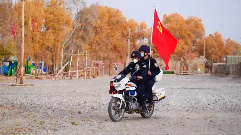 新疆平安網訊 11月23日一大早,全國公安機關愛民模范、阿克蘇地區沙雅縣公安局哈德墩派出所教導員熱合曼·艾海提騎上摩托車,帶著提前準備好的黨的二十大精神宣講材料和冬季生產生活安全防范知識,深入胡楊林向轄區群眾開展新一天的宣講。