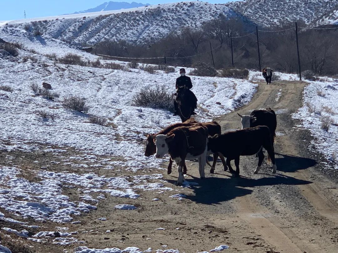 張成剛的轄區有116平方公里,轉至冬牧場后,多數牧民住進定居點,但有百戶牧民因飼養牛羊數量較多,分散居住在80余平方公里的草場上。牧戶間相隔動輒數十公里,牧區道路蜿蜒,駕車到戶平均要1個小時,部分地方需騎馬才能通過。
