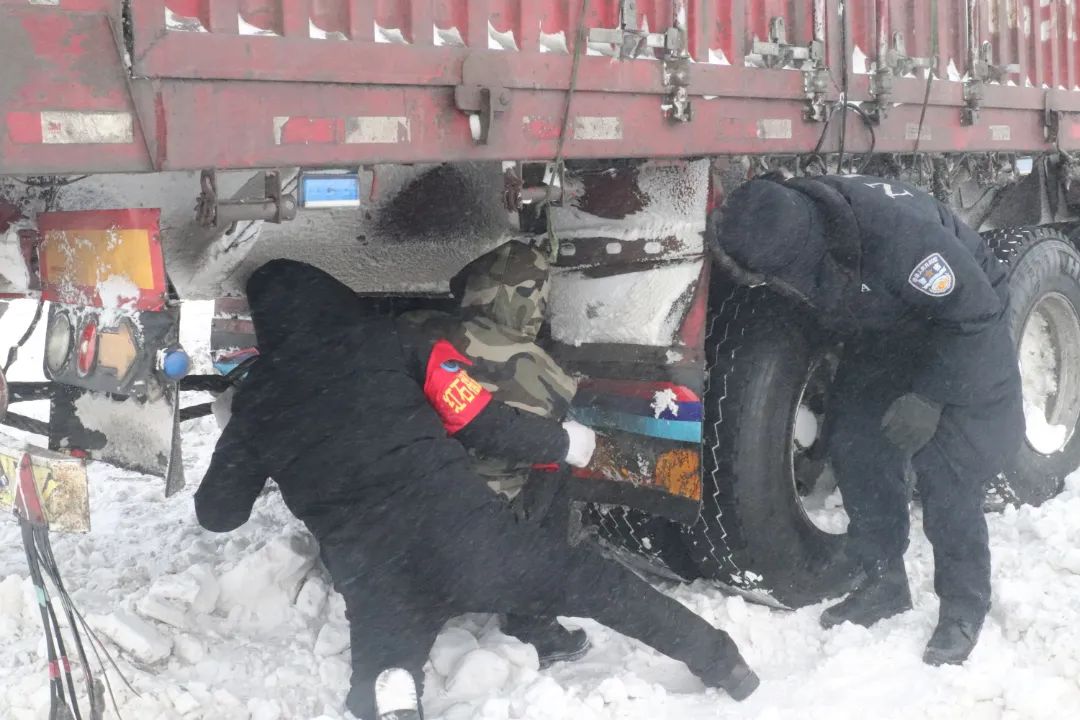 11月27日,新疆出入境邊防檢查總站哈密邊境管理支隊紅柳峽邊境派出所接到群眾求助:因風雪天氣路面濕滑,一輛運煤車不慎滑下路基,無法駛出,造成交通堵塞。