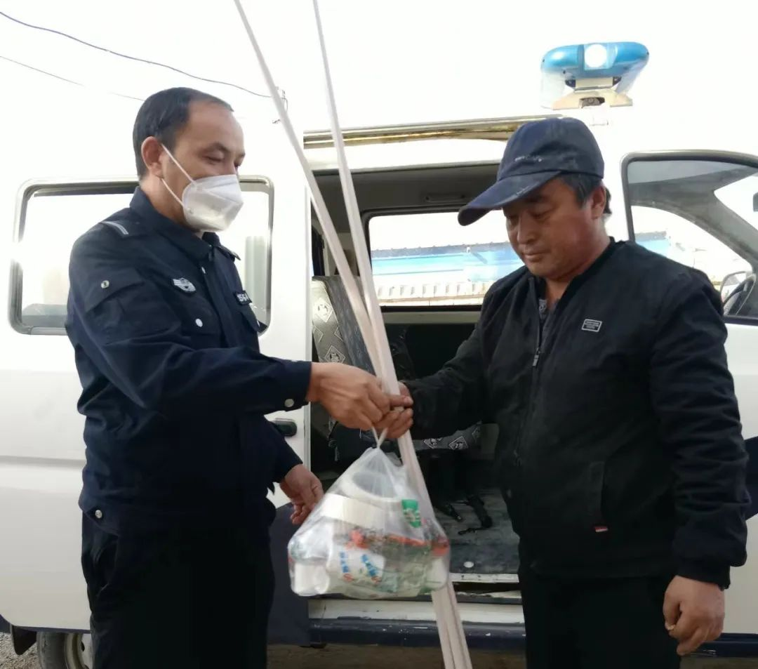 “警察同志,我們的食物已經吃光了。”王師傅等人返鄉途經伊州區三道嶺轄區時,車輛拋錨,被困高速公路,隨車攜帶的物資已耗盡,無奈之下報警求助。三道嶺公安分局青年路派出所郭鵬遠得知情況后,自費購買了馕、餅干、牛肉干、水果、礦泉水等食物,送到受困群眾手中。