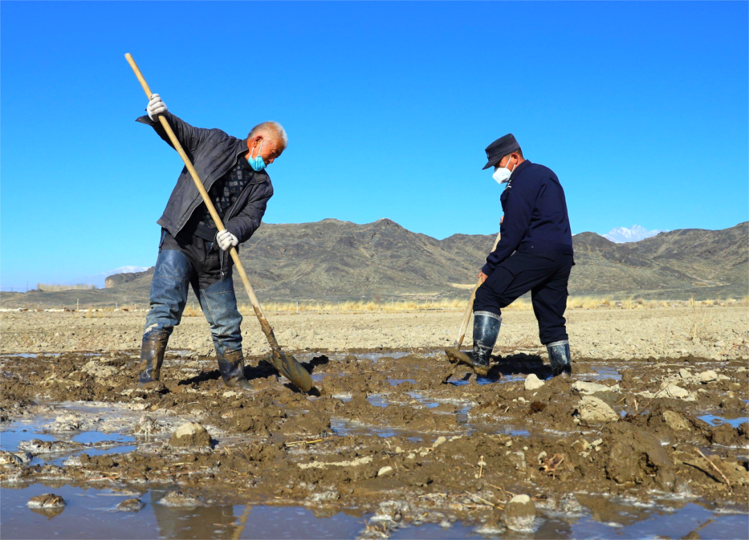 哈密邊境管理支隊沁城邊境派出所巡邏民警深入田間地頭,刨溝引水,幫助轄區群眾開展冬灌,為來年農業穩產增收保駕護航。