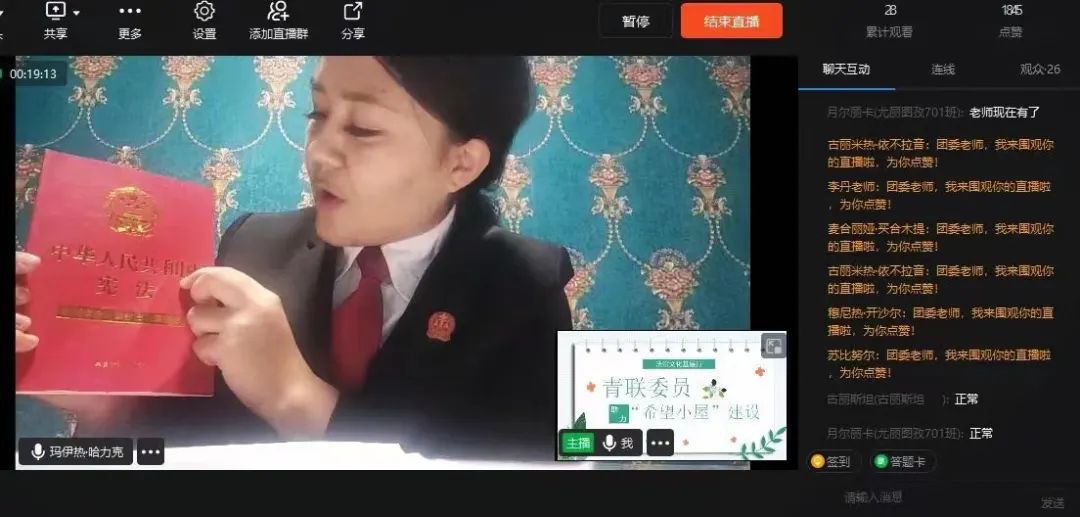 喀什地區中級人民法院民事審判第一庭庭長湯超作為喀什地區第二中學法治副校長,以“學習法律知識,做新時代的棟梁之才”為題,詳細講解了憲法的地位及憲法基本知識,通過網絡授課的形式,為在校的師生上了一堂生動的法治教育課。