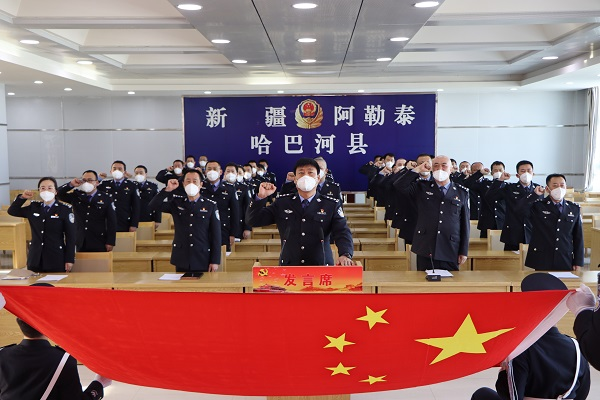 舉行憲法宣誓活動。12月7日,哈巴河縣公安局舉行憲法宣誓活動。活動現場,全體人員身著警服,奏唱中華人民共和國國歌。領誓人左手撫按《中華人民共和國憲法》,右手舉拳,領誦誓詞;其他宣誓人整齊站立,右手舉拳,跟誦誓詞。宣誓鏗鏘有力,承諾擲地有聲,整個宣誓過程莊重嚴肅。