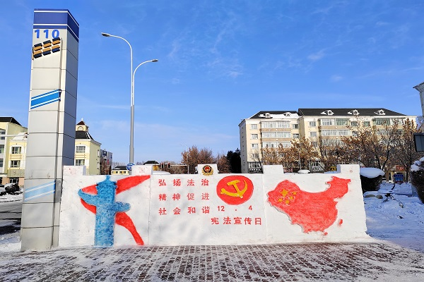 打造一面憲法宣傳雪墻。近日,哈巴河縣公安局組織民警在局機關、各所隊的顯著位置打造憲法宣傳雪墻,引起過往群眾的注意,雪墻上寫著醒目的憲法宣傳標語。民警們精心布置,筑雪墻、設計造型,一起動手創作了“弘揚法治精神 促進社會和諧”“尊崇憲法、學習憲法、遵守憲法、維護憲法、運用憲法”等多個雪墻作品,充分營造尊法學法守法用法的濃厚氛圍。