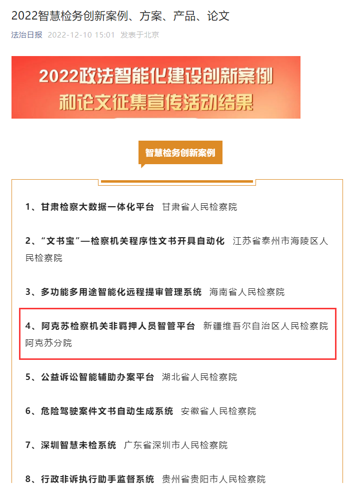 新疆平安網訊 近日,2022政法智能化建設創新案例和論文征集宣傳活動結果公布,自治區人民檢察院阿克蘇分院(后簡稱“阿克蘇地區檢察分院”)研發的“阿克蘇檢察機關非羈押人員智管平臺”,成功獲選2022政法智能化建設智慧檢務創新案例。