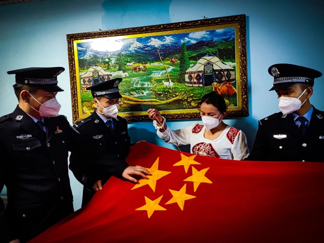 心為針,情為線。在元旦來臨之際,新疆出入境邊防檢查總站克州邊境管理支隊哈拉奇邊境派出所民警與轄區牧民共同完成了五星紅旗的繡制,以最簡單、最直接的方式向祖國致敬,迎接2023年的到來。(裴本超)