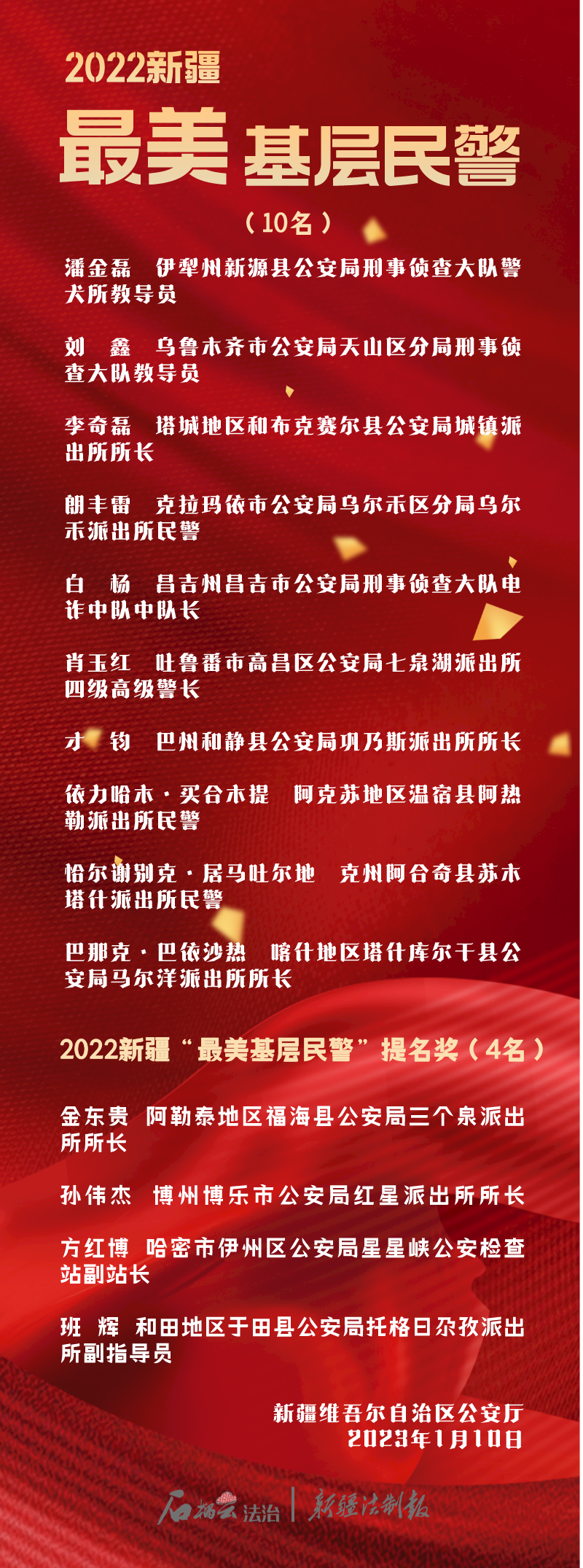 新疆平安網訊 1月10日是第三個“中國人民警察節”,自治區公安廳公布2022新疆“最美基層民警”學習宣傳活動成果,決定授予潘金磊等10名同志新疆“最美基層民警”稱號、授予金東貴等4名同志新疆“最美基層民警”提名獎。