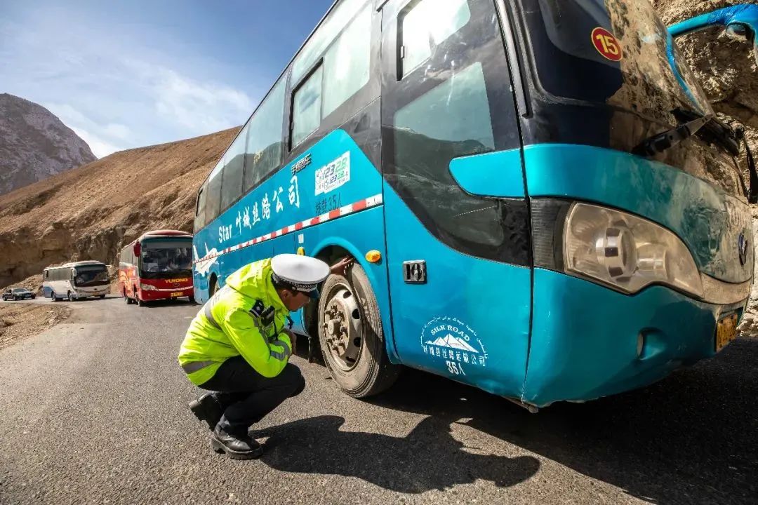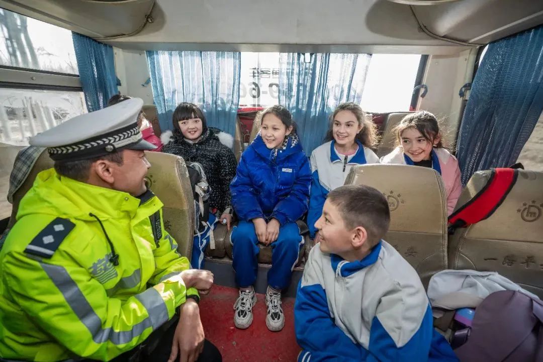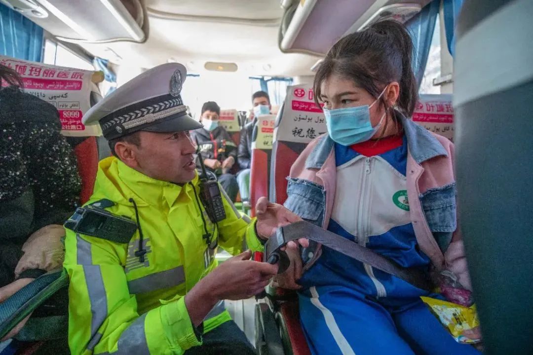孩子們集結完畢后,按照分工,何海東和同事駕駛警車在車隊前方開路,而亞森江·買買提則在大巴車上照顧孩子們。